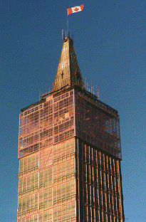 Close-up of the scaffolding "building" surrounding the Peace Tower.